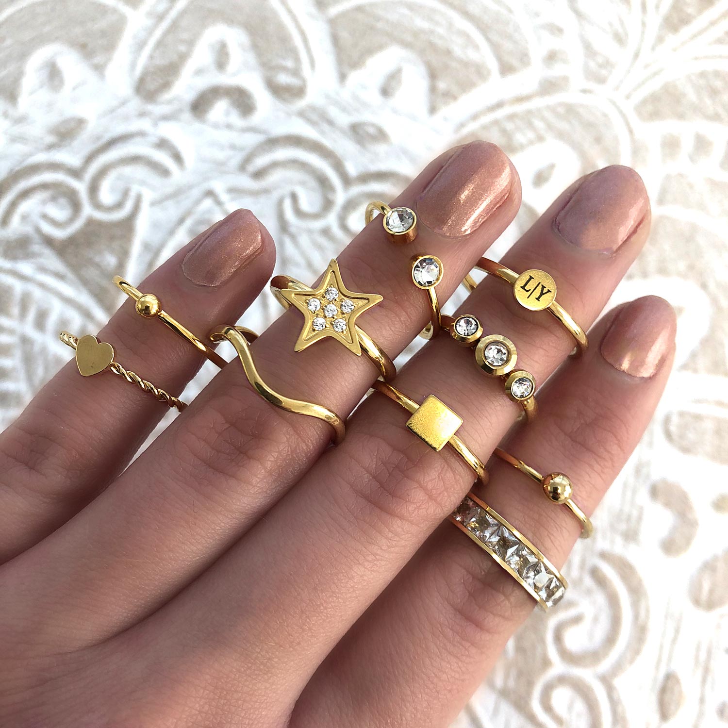 De gouden sieraden die in nederland verkocht worden hebben het gehalte 585 ofwel 14 karaat goud.